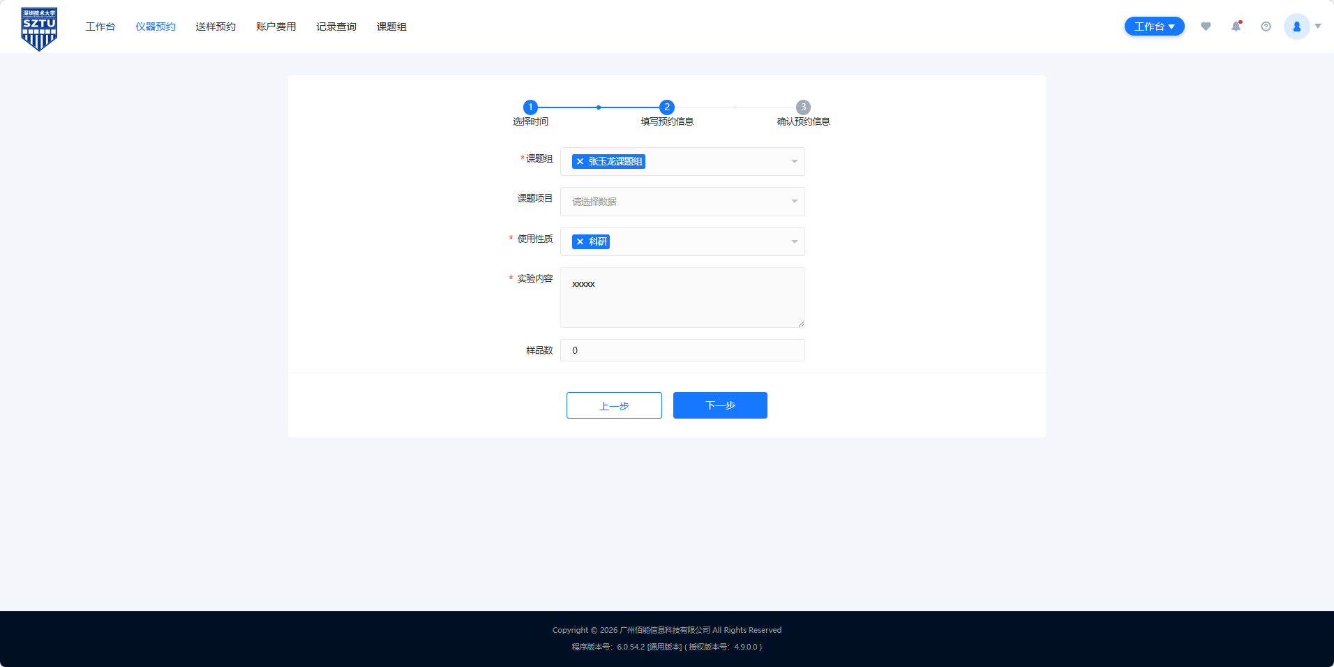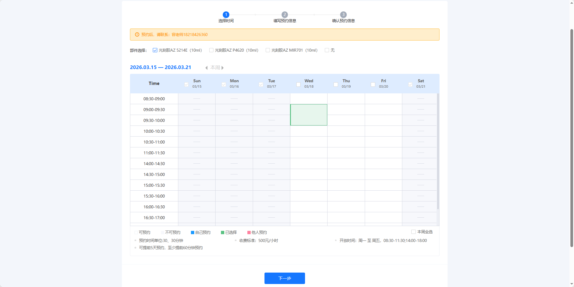 (1)需要使用中心提供的耗材等,需选择对应耗材,自带耗材的,选择无;然后选择预约时段后,点击下一步。