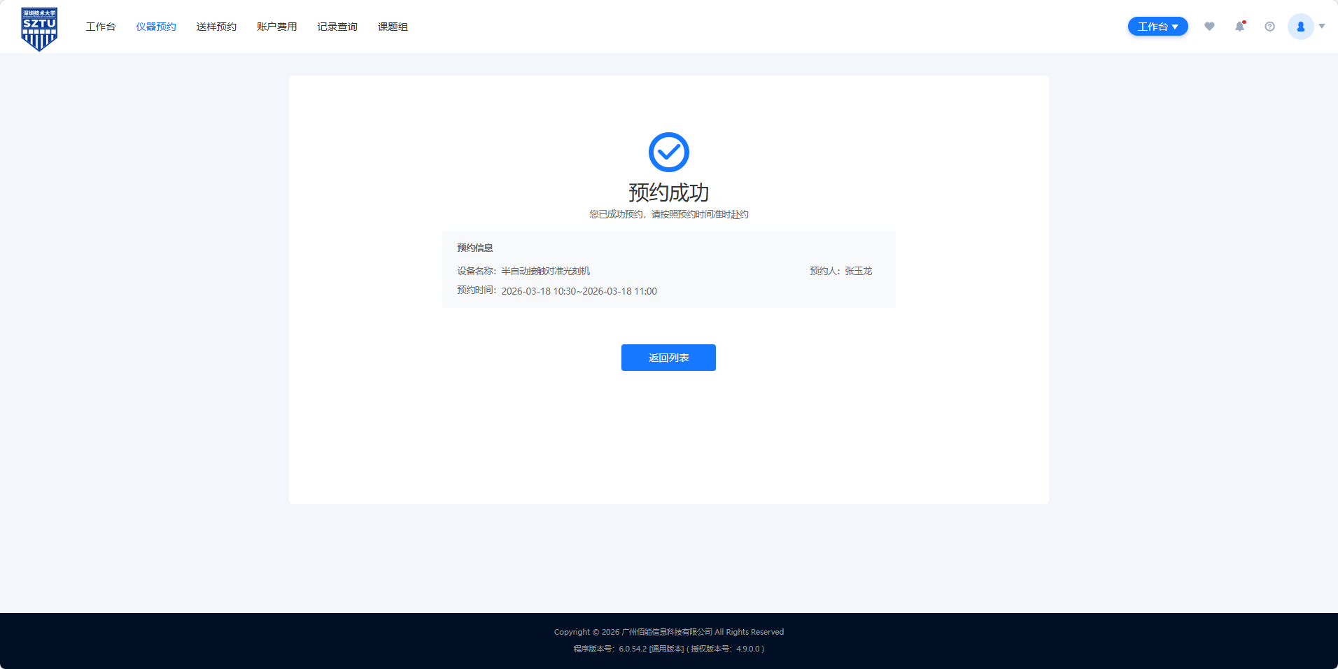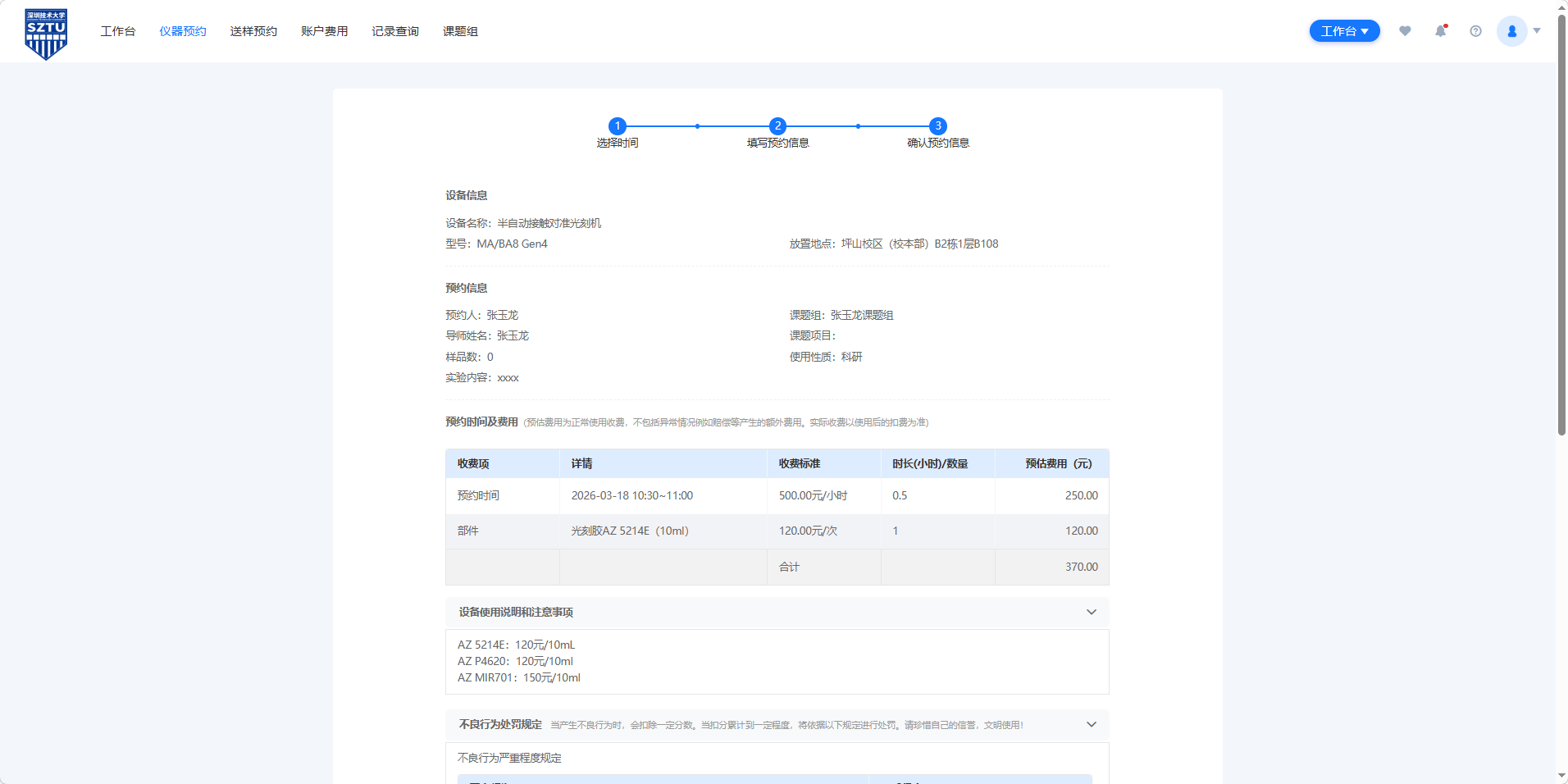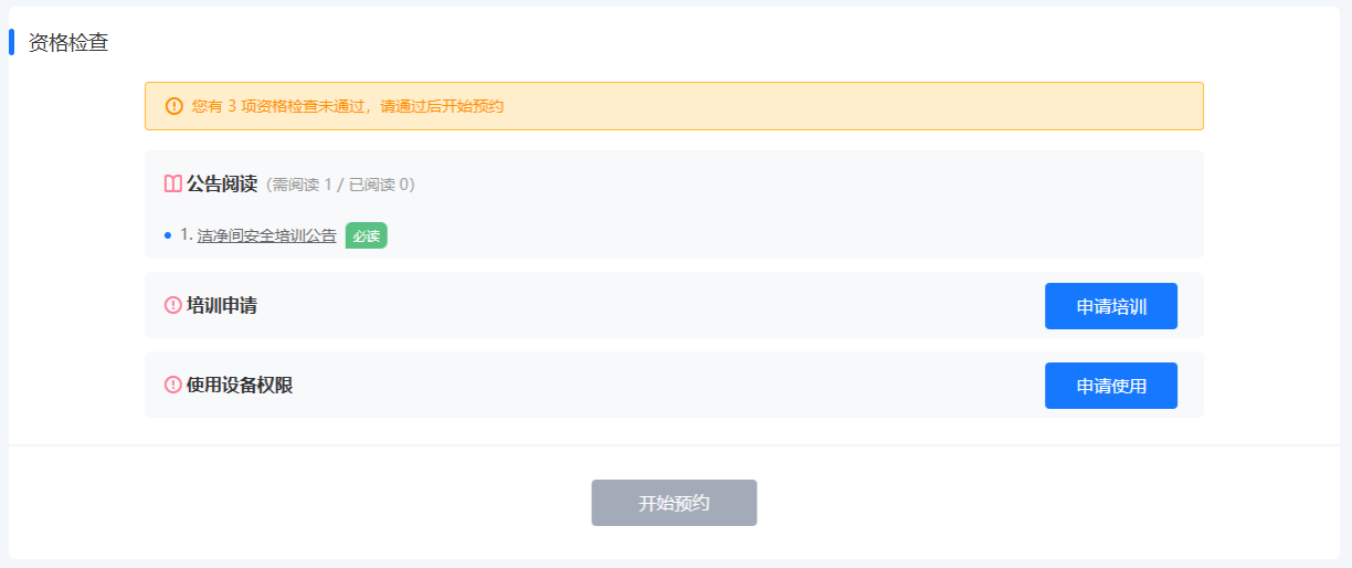 注意:完成预约后,请准时前来使用设备(可提前15分钟进入洁净室);如需取消预约,至少在开始前60分钟取消,未取消也未使用设备,也需按正常使用收费。