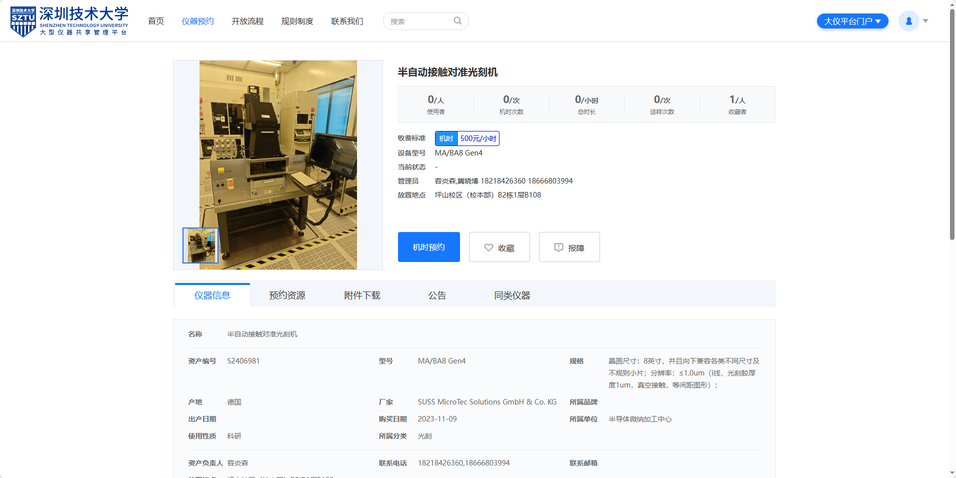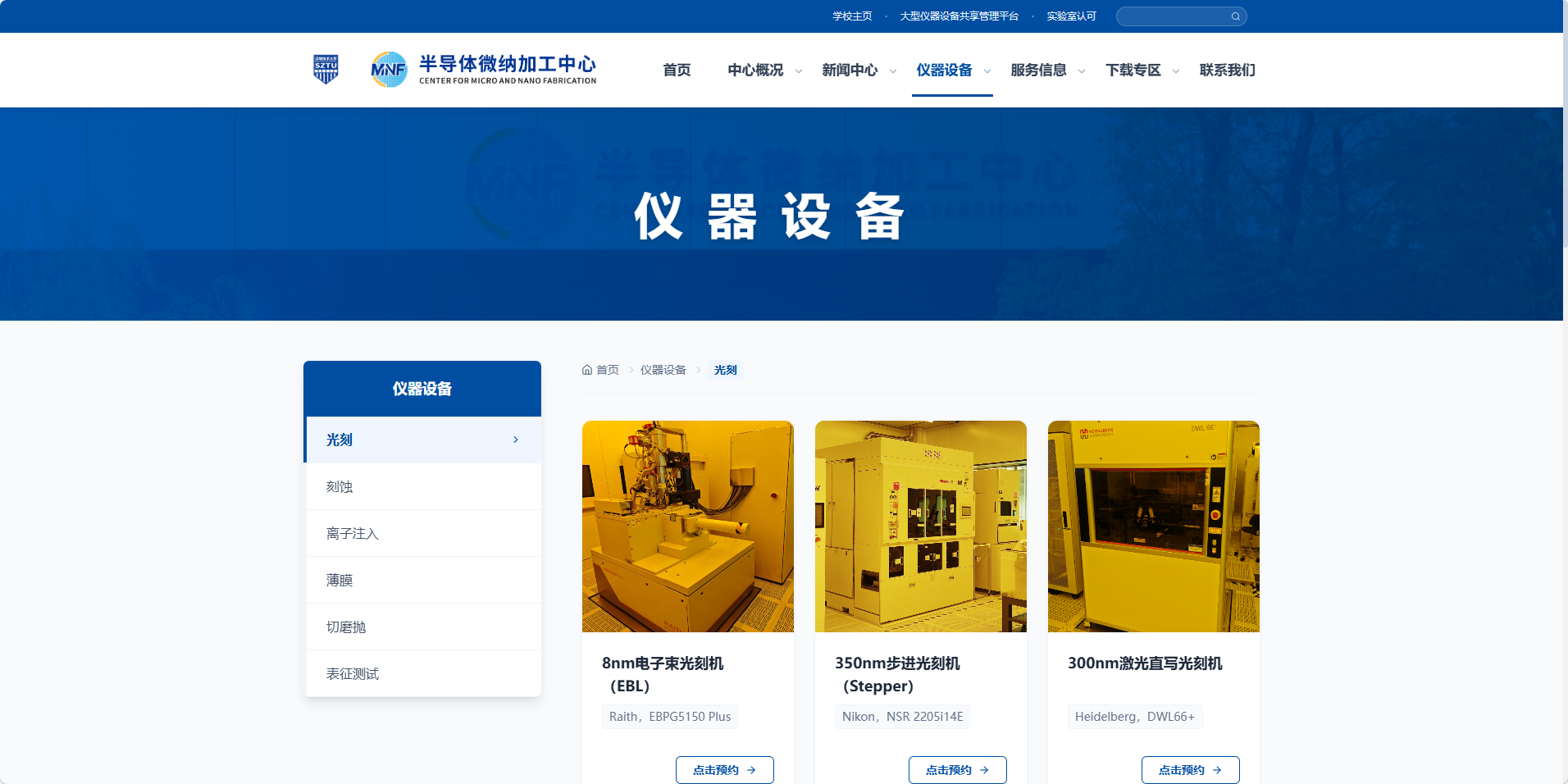 3、以800nm半自动接触对准光刻机为例,点击“点击预约”按钮,进入预约系统登录页面。