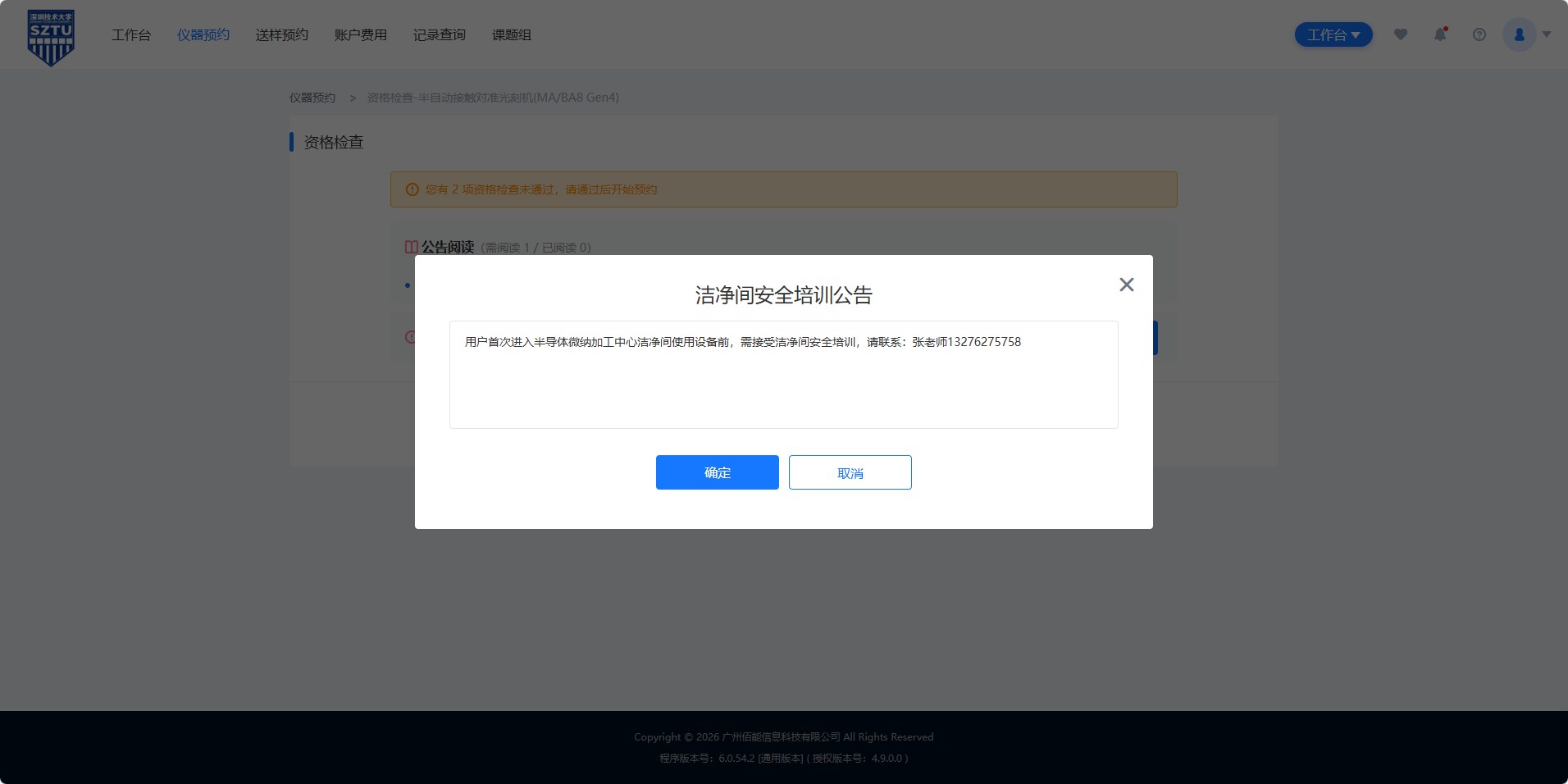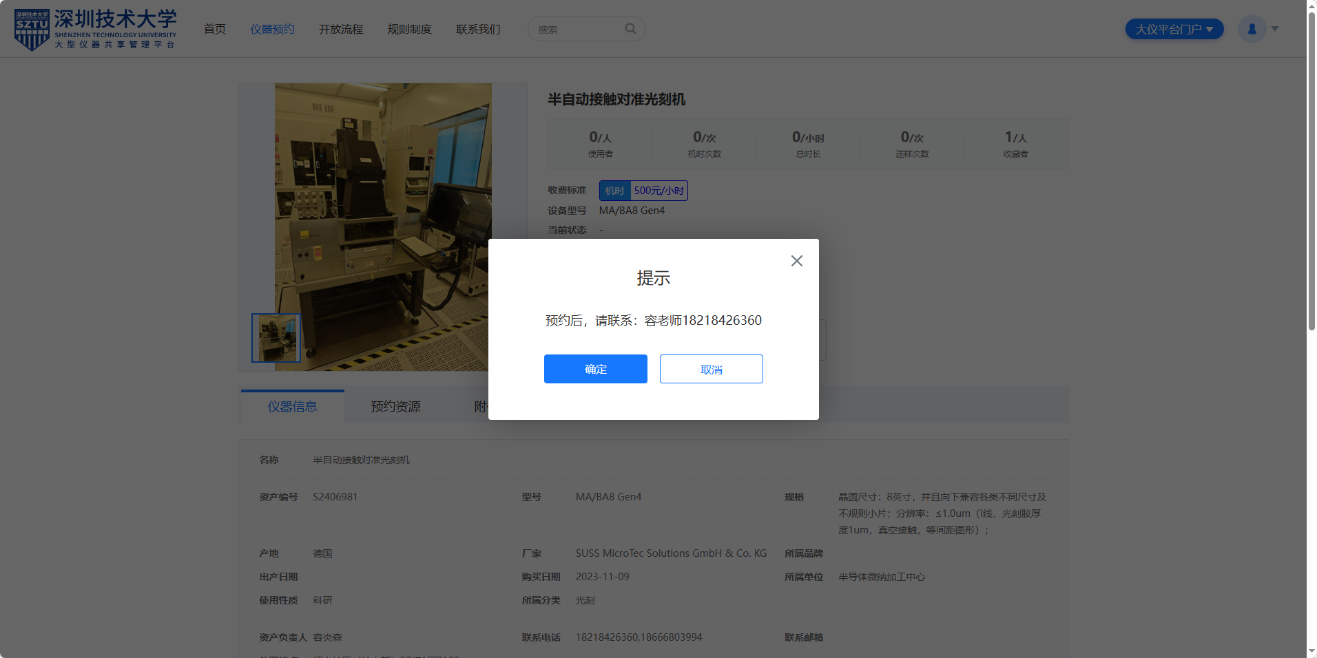 5、进入设备预约界面后,收费标准处会根据登录账号属于校内或校外自动展示机时费价格,用户点击“机时预约”按钮会提示工程师的联系方式,点击确定进入资格检查页面。