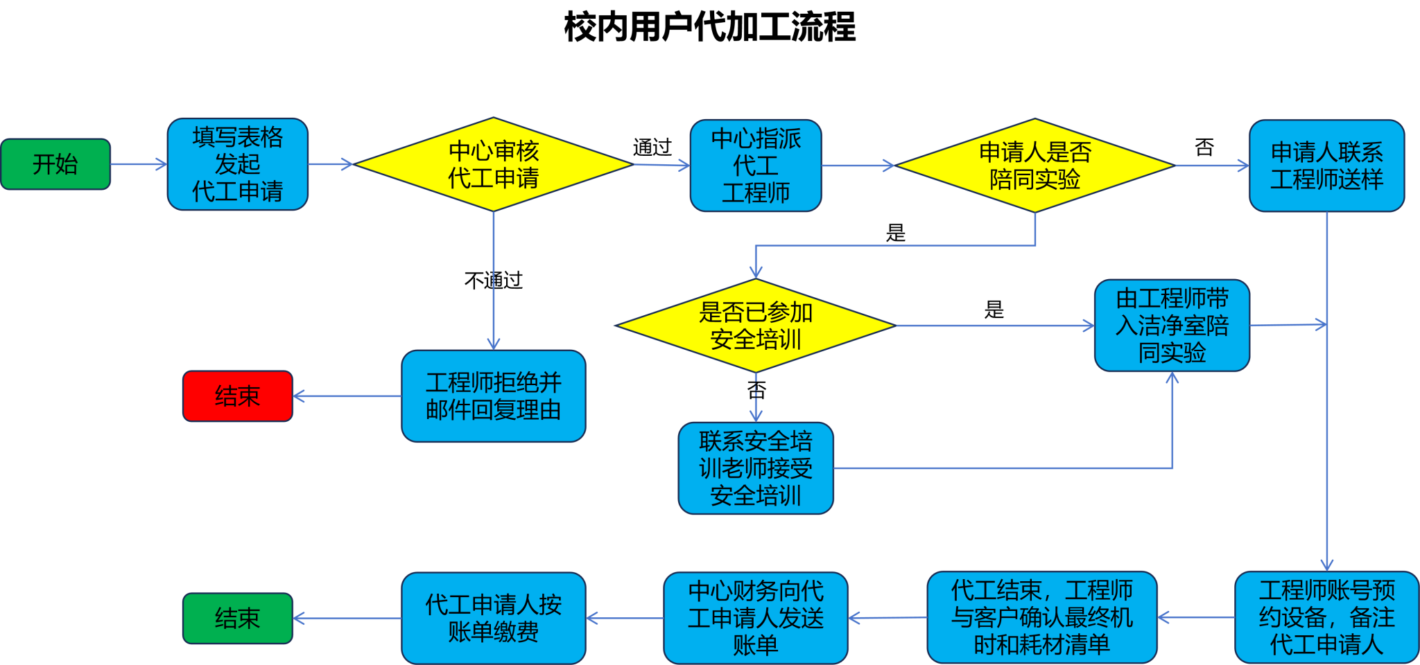 注意:代工是指由工程师代为执行工艺菜单、代为操作设备进行加工,工程师不深度参与用户研发,可为用户提供中心设备的基础工艺菜单、或工艺参数建议供用户选择,代工订单中,中心不对工艺结果负责。